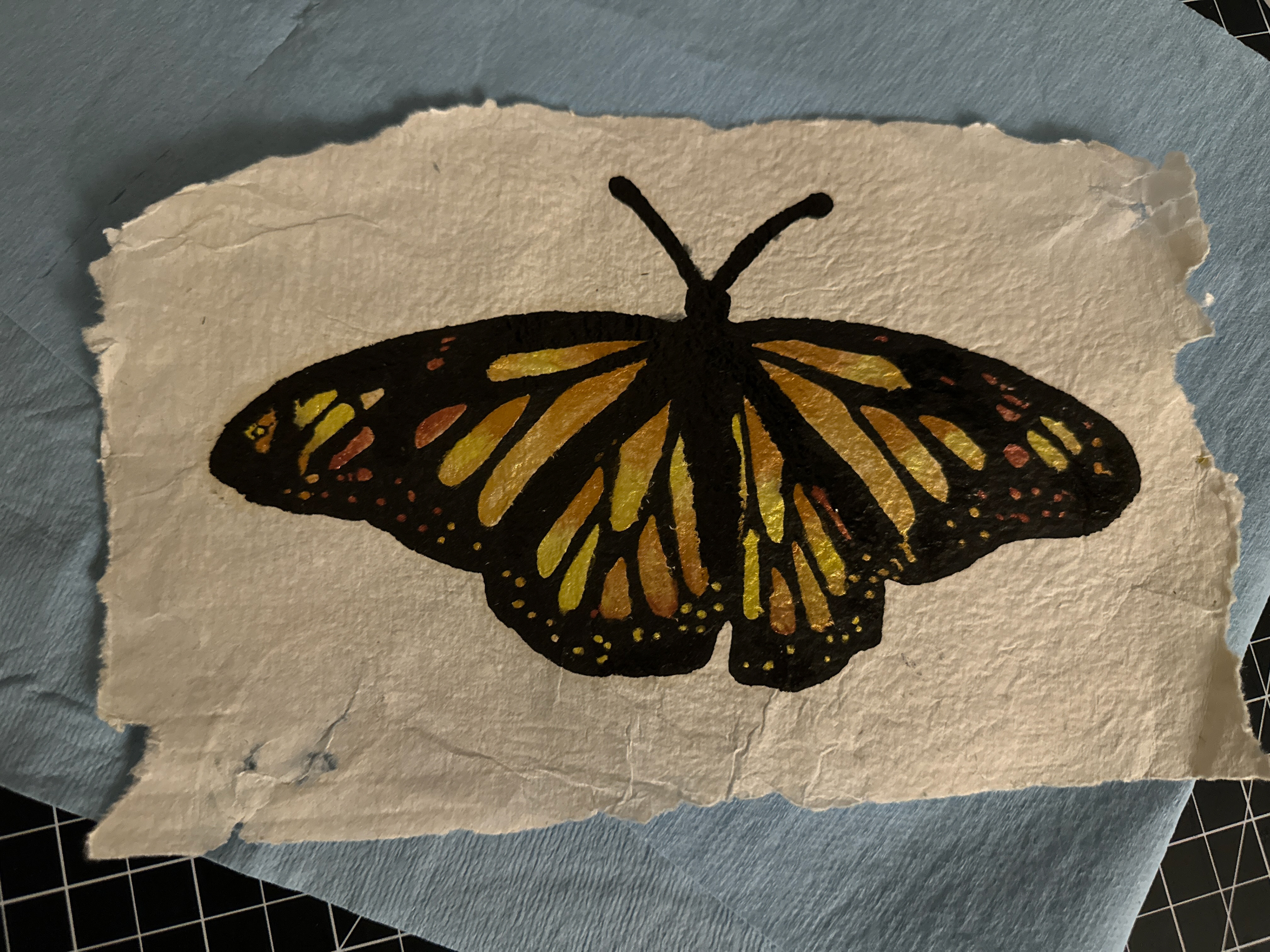 Handmade paper printed with Intaglio ink and iridescent watercolor.